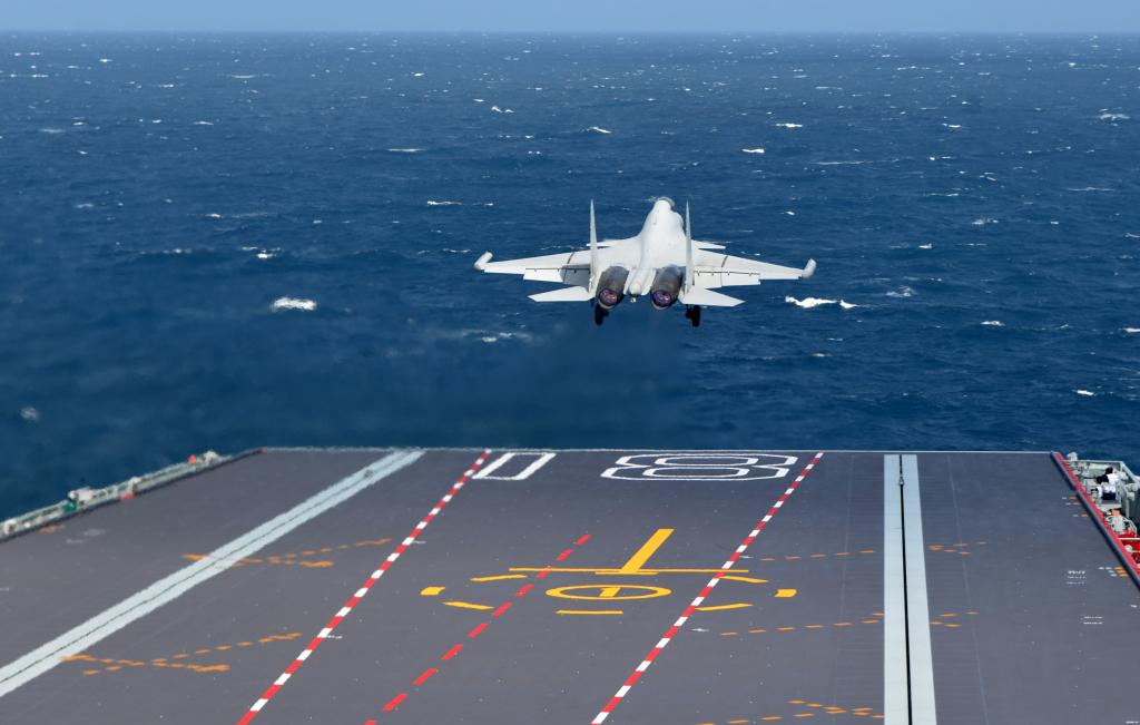 海軍福建艦開展入列后首次海上實兵訓練期間,殲-15DT艦載機彈射起飛(資料照片)。新華社發(高澤明 攝)